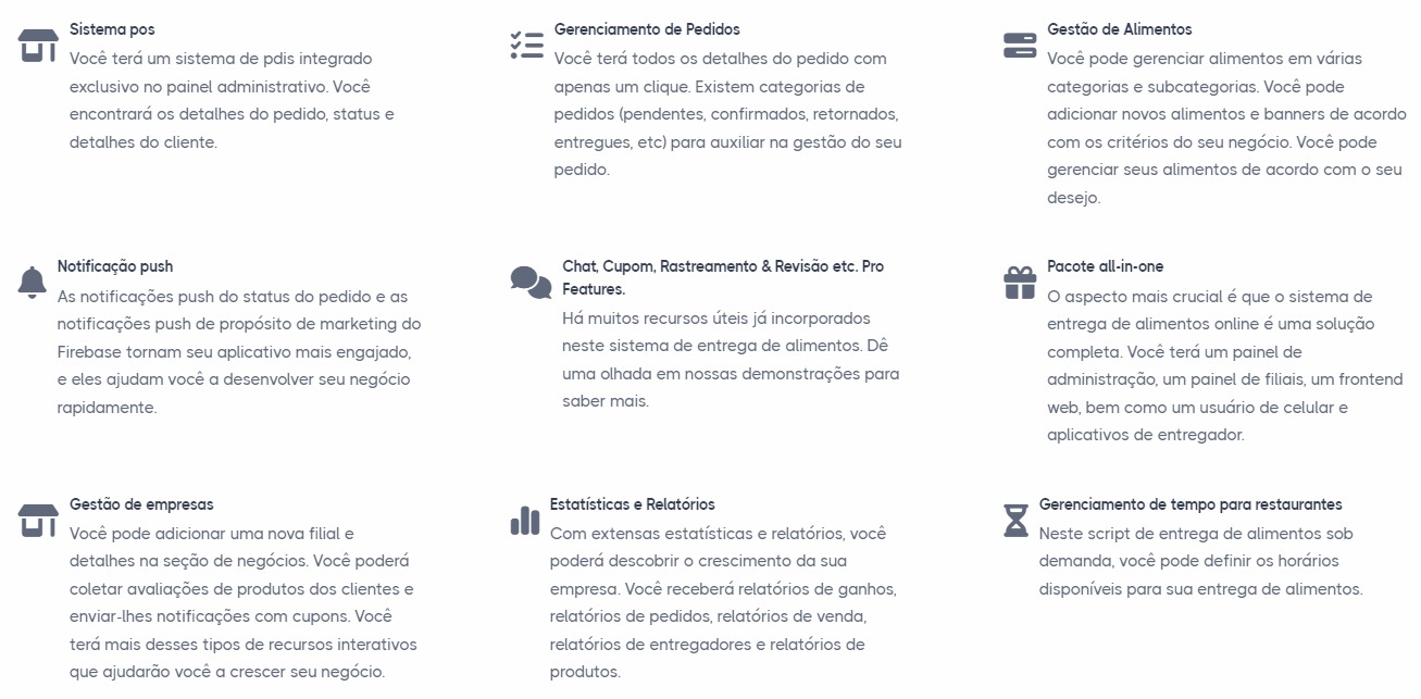 É composto por 2 aplicativos móveis (Cliente,Motoboy), 2 Painel Web(Administração e Estabelecimento) 1 pagina para pedidos